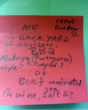 1970s Borden St. – ATE in BACKYARD of Neighbour, BBQ Madeira (Portuguese) style skewers of beef, marinated in wine, sea salt & ? (shown at right)