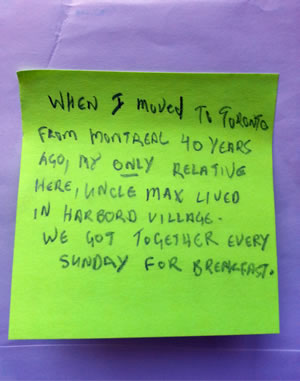 When I moved to Toronto from Montreal 40 years ago, my only relative here, Uncle Max, lived in Harbord Village. We got together every Sunday for breakfast. (shown at right)
